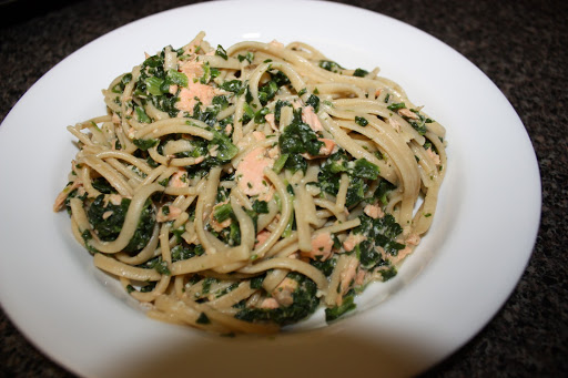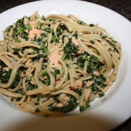 Combine pasta, sauce and salmon in large bowl or serving platter;
