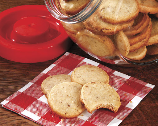 Preheat oven the 350°. Remove the dough from the freezer and thinly slice, about 1/4-inch thick. Place on ungreased cookie sheets and bake for 12-15 minutes. Let cool for 5 minutes and then transfer to wire racks to cool completely.