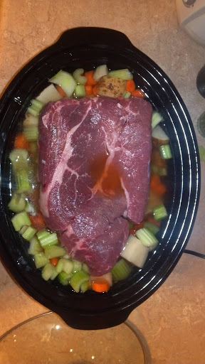 1 In a slow cooker, mix cream of mushroom soup, dry onion soup mix and water. Place pot roast in slow cooker and coat with soup mixture. 2 Cook on High setting for 3 to 4 hours, or on Low setting for 8 to 9 hours.