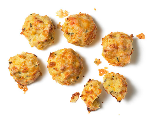 Scoop tablespoon-size mounds of dough onto the prepared baking sheets, about 2 inches apart. Sprinkle with more cheese. Transfer to the oven and bake until golden brown and puffy, 20 to 25 minutes. Serve warm.