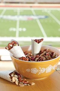 1. Preheat onen to 300. Line a baking sheet with parchment paper. In a large bowl, combine cereal, pretzels, pumpkin seeds, butter and pie spice. Spread on prepared baking sheet in asingle layer. Bake for 20 minutes, stirring at 10 minutes. Let cool slightly, about 10 minutes.