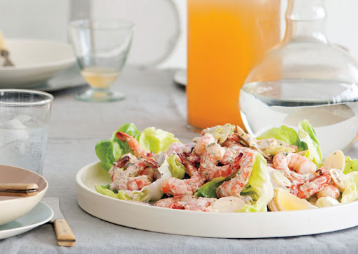 Fold hearts of palm and sliced celery into shrimp. Season with salt and pepper. Serve on lettuce leaves with lemon wedges.