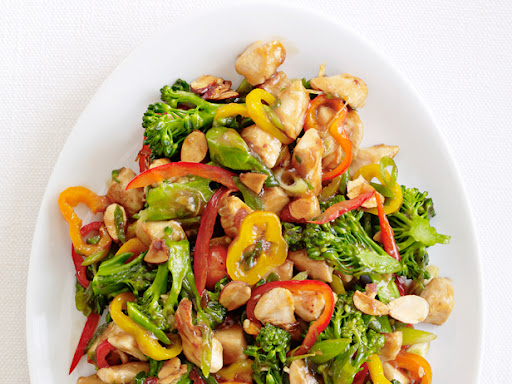 Heat 1 tablespoon olive oil in a large nonstick skillet over medium heat. Add the chicken and cook, stirring, until no longer pink, about 4 minutes. Transfer to a plate. Increase the heat to high and add the remaining 1 tablespoon olive oil. Add the garlic and ginger; stir-fry 30 seconds. Add the scallions and peppers; stir-fry 1 more minute. Add the chicken, broccolini and nuts and stir-fry 2 more minutes.