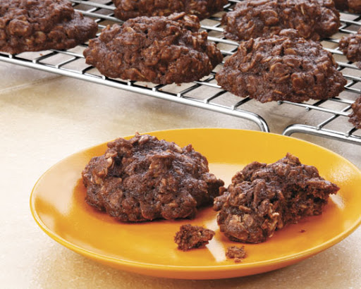 Preheat oven to 350°. In a heavy-bottomed saucepan, melt the shortening and butter. Set aside to cool. In a large bowl, sift together the flour, sugar, baking powder, COCOA and salt. In a small bowl, lightly beat the egg with the milk and VANILLA. Add to the dry ingredients along with the shortening/butter mixture and stir until well combined. It is best to do this by hand, not with a mixer. Stir in the oatmeal. Drop by the tablespoonful onto greased baking sheets. Bake at 350° for 12-15 minutes. Cool on paper towels. Serve with milk and a smile!