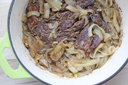 Add olive oil to the Dutch oven and brown all sides of beef roast. Then add the sliced onions, sugar, balsamic and all the seasonings.