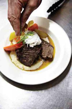 Liberally salt and pepper the meat. Heat canola oil in large braising pan. Brown chuck roast on all sides. Add celery, carrots, onions, garlic and herbs. Add two parts chicken stock and one part red wine just to cover meat. Cover pan with tight-fitting lid or foil. Place in 400-degree oven for three-and-half to four hours, or until meat is tender. Remove meat and veggies from pan and reduce liquid on stovetop by half. Serve the roast over mashed potatoes, with pan jus over the top.