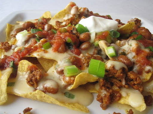 Top with the meat and bean mixture, once again covering all the chips. Drizzle with the remaining cheese sauce and sprinkle with green onions.