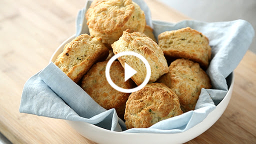 Preheat oven to 450 degrees. In a food processor, pulse flour, baking powder, baking soda, and salt until combined. Add cheese, butter, and chives; pulse until mixture resembles coarse meal, with a few pea-size pieces of butter remaining. Add buttermilk and pulse until combined (do not overmix).