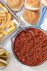 2. Add tomato sauce, tomato paste, Worcestershire sauce, brown sugar, mustard, pepper and salt. Bring to a boil over medium-high heat. Reduce heat, and simmer for 20 minutes, stirring frequently. Serve over hamburger buns with fries and pickle spears.