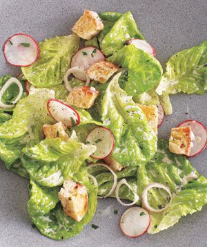 lettuce, radishes, shallot, and croutons and toss to coat.
