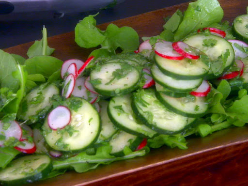 Combine the sliced radishes, sliced cucumber, mint and cilantro in a medium bowl. Whisk together the lime juice, olive oil, and salt and pepper, to taste, until well combined. Pour the dressing on top of the salad and toss to combine. Place arugula on a serving dish and top with tossed salad. Serve immediately.