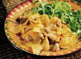 Heat oven to 400 degrees. Mix potatoes, sauce mix, water, corn and milk in an ungreased 2 qt casserole. Stir in beef and 3/4 c cheese. Add 1 Tbsp finely chopped red and green pepper, if using.