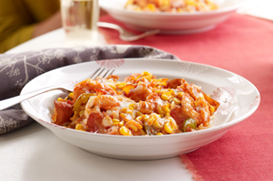 ADD onions, peppers and garlic to reserved drippings; cook and stir 5 min. or until crisp-tender. Stir in tomato sauce and salsa; simmer 2 min., stirring occasionally. Stir in shrimp and corn; simmer 2 min. Stir in bacon.
