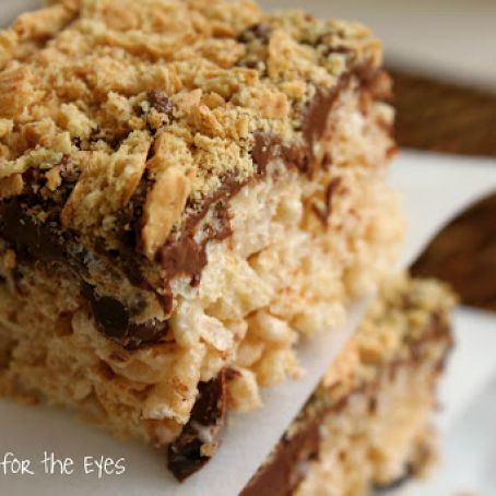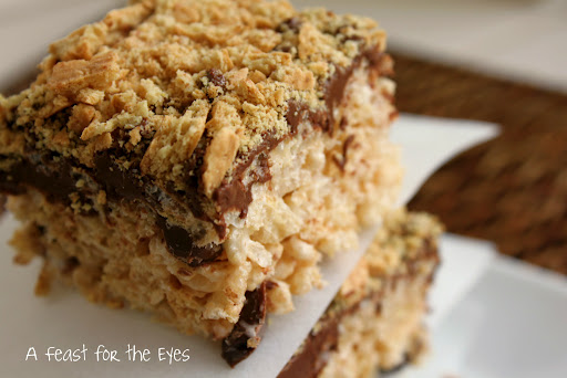 The best of both worlds are brought together, with Rice Krispie Treats and Hershey's Milk Chocolate and Graham Crackers. The marriage is complete with plenty of melted marshmallow. I found this recipe on "Greens and Chocolate" blog who adapted it from "Glorious Treats". These are super easy to make, involves no baking, and will disappear fast.