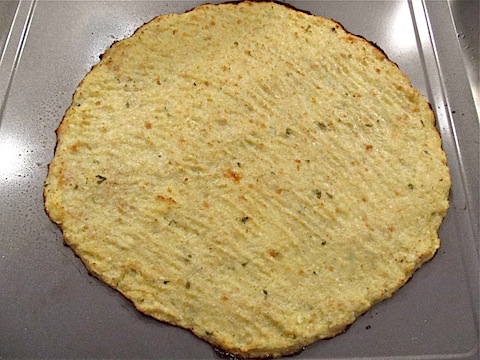 In a medium bowl, combine cauliflower, egg and mozzarella. Press evenly on the pan. Sprinkle evenly with fennel, oregano and parsley.