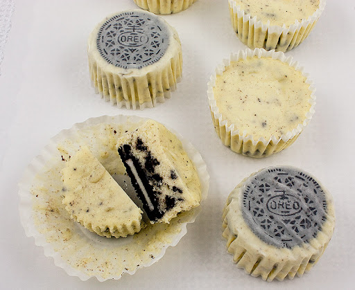Preheat oven to 275 degrees. Line standard muffin pans with liners. Place 1 whole cookie in the bottom of each liner.