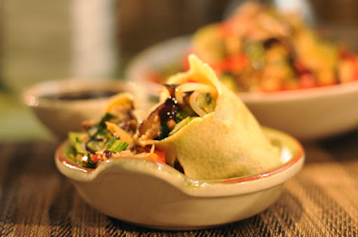 1. Prepare or warm the pancakes and keep warm. Trim and thinly slice the scallions (about 1/2 cup); transfer them to a small bowl. Peel and Microplane-grate the ginger (about 1 tablespoon) and add to the bowl; press the garlic (about 1 tablespoon) into the bowl and stir to combine.