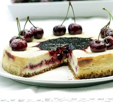 Rinse out the food processor again, then tip in the cheese, cornflour, eggs, remaining sugar, vanilla, orange and half the crème fraîche. Blend until smooth. Spoon half the mix into the tin, then spoon half the cherry purée evenly over the top. Spoon the remaining cheesecake mix over this. Stir the mix gently with a fine skewer to swirl the cherry purée through it. Bake for 45 mins, then turn the oven off and leave for 30 mins. Spread the remaining crème fraîche over the filling, then spoon the remaining cherry purée into the centre. Using a fine skewer draw the cherry purée through the crème fraîche to make a star pattern, wiping the skewer each time. Set the reserved cherries around the edge of the cheesecake, then dust with icing sugar. Chill until ready to serve.