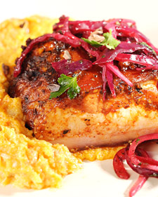 Presilla’s version of a popular Central American table condiment—delicious piled on top of tamales and enchiladas or eaten with beef—has a vegetal sweetness and a brightness that cuts the lushness of marinated slab bacon. Beet juice augments the color even more.