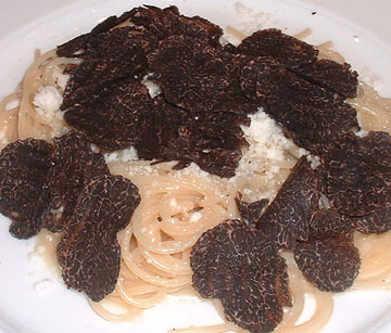 Divide the spaghettini evenly among 4 heated pasta plates. Divide the crumbled Castelmagno cheese among the servings. Generously shave the black truffle over the top of the pasta and serve immediately.