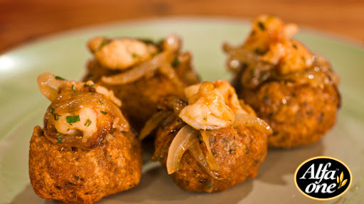 Make an incision of about 2cm on the top of the fritter and fill with a spoonful of the onion and prawns. Serve warm.