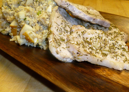 3. Bake, covered, in a 350° oven about 30 minutes or until no pink remains in chops and juices run clear. Transfer chops to serving plates. Stir chopped pear and blue cheese into hot rice mixture; serve with chops.