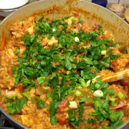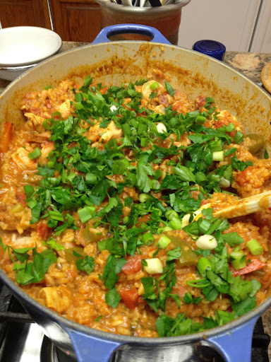 Cook bacon in a large pot. Remove bacon, crumble and set aside. Cook onions and celery in bacon fat till softened. Add garlic and cook for another 5 minutes. Add seasonings and chicken. Cook chicken until outside turns white. Add bacon crumbles and rice and cover, stirring frequently for 5 minutes. Add peppers, bay leaves, tomatoes and broth. Bring to boil. Turn down heat, cover and simmer until rice is cooked. Turn off heat and stir in shrimp. Cover for 5 minutes. Check shrimp for doneness. Garnish with green onions and parsley.