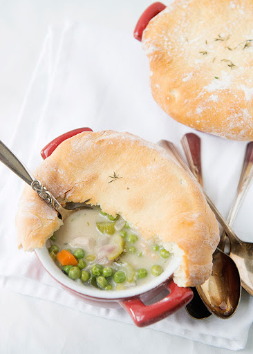 Ladle chicken into oven safe bowls. Roll dough ball out on a floured surface, about 2 inches larger than bowl. Wet the rim of the dish and cover with dough. You can brush with melted butter if desired.