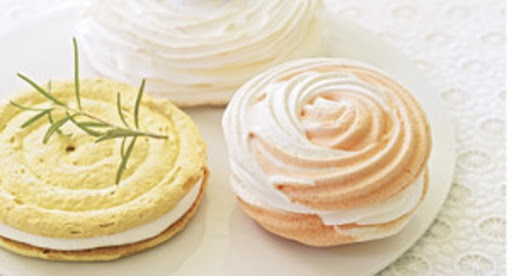 Pipe a silver dollar-size dollop of the filling onto the flat side of a meringue rosette and sandwich with a second meringue. Serve the assembled meringue tarts immediately.