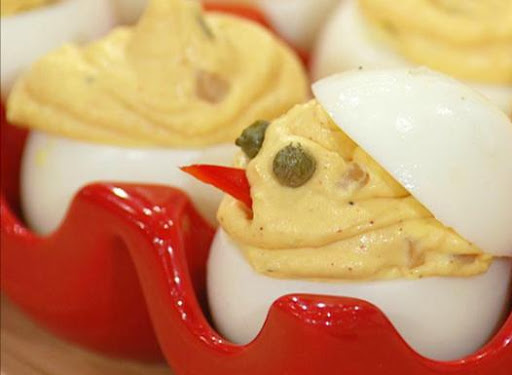 Cut a corner off a plastic bag and fill with the deviled filling. Pipe into egg whites and garnish with a thinly sliced red chili pepper for the beak and 2 capers per egg for the eyes. Top with trimmed egg top.