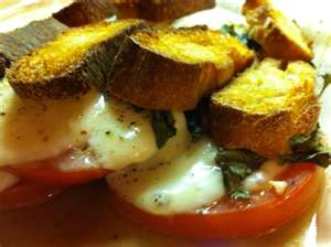 Arrange the tomato slices on the bottom of the baking sheet in a single layer. Drizzle with the balsamic vinegar. Lay the cheese slices on top in a single layer. Sprinkle with the garlic and basil and drizzle with olive oil. Season with salt and pepper, to taste. Arrange the bread slices on top and drizzle with olive oil. Bake for 25 minutes until the filling is bubbling and the bread is crisp and golden. Remove the pan from the oven and let cool for 5 minutes before serving.