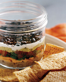 Spread 1/2 inch mashed beans into bottom of each jar. Top with 2 tablespoons cheddar, 1 tablespoon scallions, cup tomato mixture, 3 tablespoons avocado mixture, 2 tablespoons sour cream, then 2 1/2 tablespoons olives. (Alternatively, layer all ingredients in a large bowl.) Serve with chips.