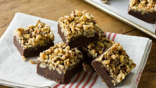 4.Pour into a 12 x 9-inch baking pan. Sprinkle walnuts on top, pressing slightly into batter.