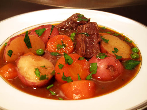 Remove pot from oven, add potatoes and carrots, cover, and return to oven. Simmer until meat is just tender, about 1 hour. Remove stew from oven. At this point it can be cooled, covered, and refrigerated up to 3 days.