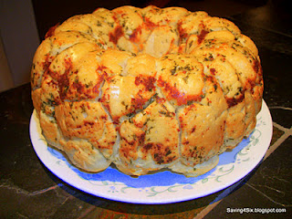 Divide dough into thirds. Tear off small pieces and coat them in the butter mixture. Place in the bottom of a greased bundt pan until you've used up one of the thirds. This should cover the bottom of the bundt pan. Generously sprinkle Parmesan cheese on the layer of dough and then begin another layer. You will have 3 layers in all. Cover the dough and let rise for 40 minutes.