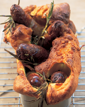 3. At this point, take the tin out of the oven, being very careful, and pour your batter over the sausages. Throw a couple of sprigs of rosemary into the batter. It will bubble and possibly even spit a little, so carefully put the tin back in the oven, and close the door. Don't open it for at least 20 minutes, as Yorkshire puddings can be a bit temperamental when rising. Remove from the oven when golden and crisp.