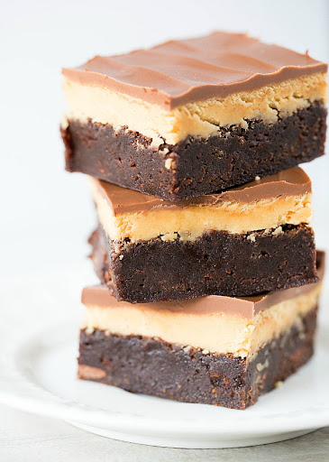 5. Make the Chocolate-Peanut Butter Glaze: Melt together the chocolate chips and peanut butter in the microwave on 50% power, stirring every 30 seconds, until completely smooth and melted. Pour the mixture over the peanut butter layer and spread into an even layer with a spatula. Refrigerate for at least 30 minutes, or until set.
