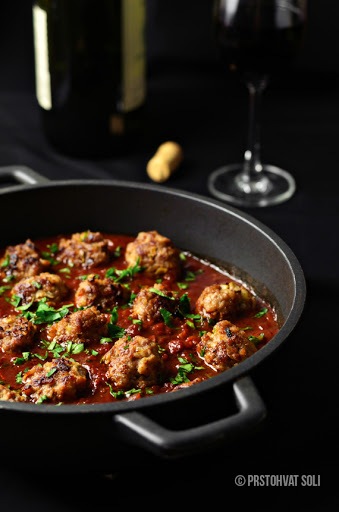 Remove the meatballs from the fridge and fry them on all sides in a hot frying pans with a little oil. Towards the end of the cooking sauce, fried meatballs insert and cook together for 10 minutes. Before serving sprinkle with finely chopped celery leaves and serve with a side dish of your choice.
