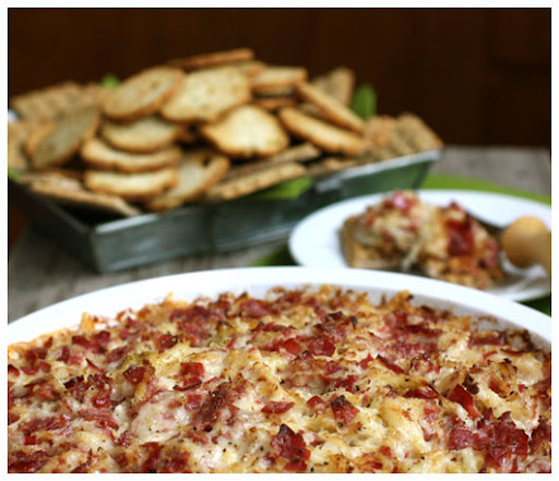 In a large bowl, mix all ingredients together. Spoon into a serving dish that can be placed in the oven (a 9″ pie plate works great!). Bake at 400° for about 20 minutes, until it is bubbling and nicely browned. Serve with your favorite sturdy crackers. I used rye crackers and bagel chips, but think pumpernickel crisps would be good, too.