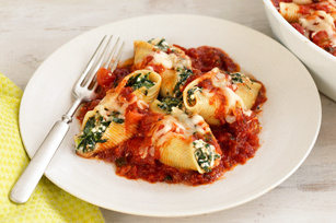 MIX cottage cheese, spinach, 1/2 cup mozzarella, Parmesan and seasoning; spoon into shells.