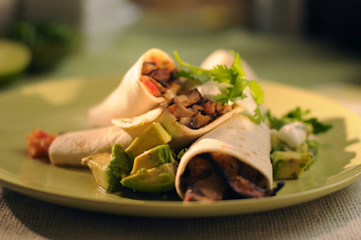 7. Spoon some of the mushroom mixture onto each of the 8 tortilla and roll up the tortillas. Transfer 2 tortillas to each of 4 dinner plates and top each tortilla with some of the sour cream, chopped avocado sprinkled with salt, and cilantro.