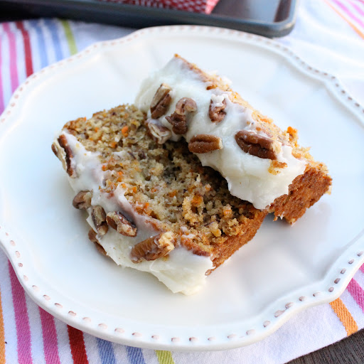 6. To make the frosting - Cream together the cream cheese and butter until smooth. Add in powdered sugar until desired consistency is reached. Frost cooled loaf with frosting and sprinkle walnuts or pecans on top. Store in the fridge in an air tight container.