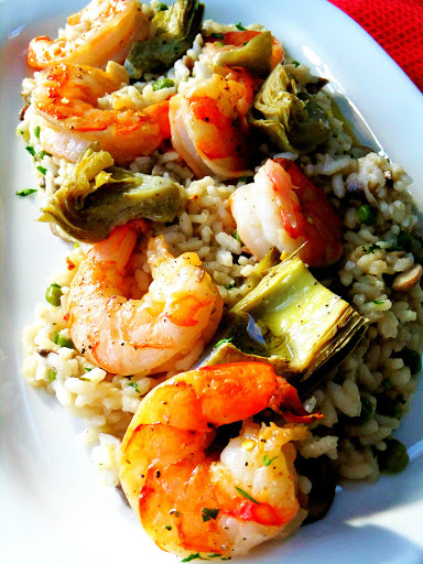 Shrimp, artichokes and risotto is a perfect lighter meal. Using garlic infused olive oil gives the dish a subtle, and not overwhelming garlic flavor. Serve with some crusty bread and butter.