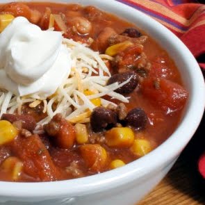 Now add the cans of beans, sou, tomatoes, corn, and chilis along with water.