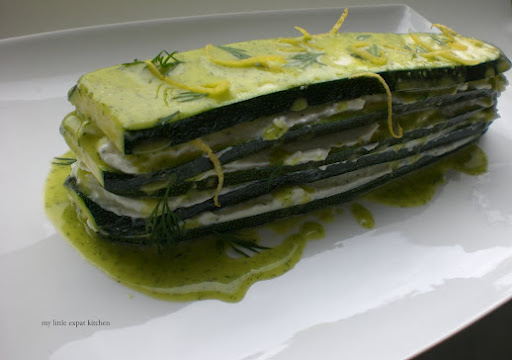 Take one slice of zucchini and, using a small spatula or spoon, spread 1 1/2 - 2 Tbsp of the creamed cheese mixture over it, creating a thin layer, about 1 cm thick. Take another zucchini slice and spread a thin layer of cheese mixture over it. Take the second slice and place it on top of the first one. Continue until you have created 4 layers of zucchini and cheese mixture. Place a single zucchini slice (without cheese mixture) at the top of the tower and put it on a serving platter or an individual plate, with the help of an offset spatula.