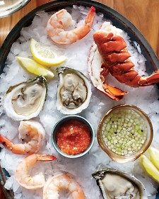 The key to this dish is to leave the heavy lifting to a fish purveyor, who often will steam the shellfish, an shuck the oysters for a minimal charge. Make the simple suaces earlier in the day and your woerk is done. For the serving tray, by crushed ice or place a few cups of ice in a plastic bag, wrap in a dish trowel, and crush using a rollng pin or a meat tenderizer.