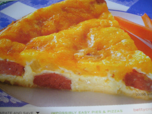 Heat oven to 400. Spray 9" glass pie plate w/ cooking spray. Layer hot dog pieces and onion in pie plate.