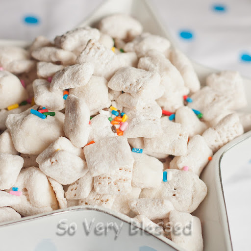 Tip - The above method worked just fine for me, but some people are having trouble with the Chex and Almond Bark clumping together. Try thinning out the Almond Bark a little with shortening and mixing the Chex with the melted Almond Bark before coating with the cake mix and powdered sugar.