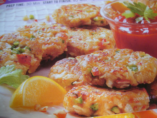 Mix veggie mixture and remaining ingredients except cocktail sauce. Shape mixture into 2 dozen 1 1/2 " patties. Place on cookie sheet. Bake 12 mins, turning once, till golden. Serve w/ cocktail sauce.