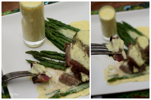 Remove the lid of the blender (or the center piece in the lid) and start pouring in the hot butter in "droptlets" while the blender is still on high speed. Continue pouring slowly, giving the yolks time to absorb the butter. Once the sauce starts to thicken, you can start to pour a little quicker. You should now have a thick, rich sauce.